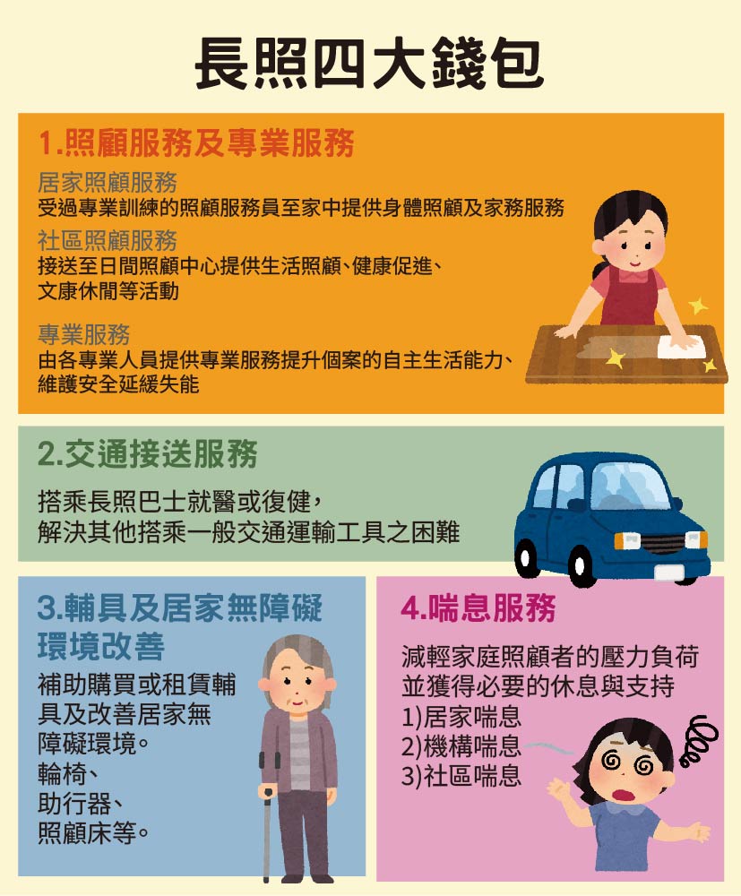 其實,長照2.0將補助概念整理為大家常聽到的——「長照四大錢包」。只要善用這四大類資源,就能大幅減輕照顧負擔,讓長輩獲得更穩定、適切的照顧。